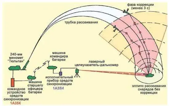Сам боєприпас являє собою керовану міну великого калібру, оснащену системою корекції траєкторії польоту. У її головній частині розміщені бойова частина та система наведення, що реагує на лазерне підсвічування цілі. Після пострілу з міномета мина рухається за балістичною траєкторією, а на завершальній ділянці польоту активується система наведення, яка коригує напрямок руху боєприпасу, спрямовуючи його на ціль, підсвічену лазерним цілевказувачем. Для застосування комплексу використовується спеціальне обладнання лазерного підсвічування, яке може розміщуватися на передових спостережних пунктах або у складі розвідувальних підрозділів.